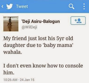 According to this twitter user, his friend's daughter lost her life because his baby mama/ex did not deem it fit to seek his (the father's) financial help. His tweets after the cut. He also posted a picture of the late girl but we'll leave it out because after all, this is just one side of the story...